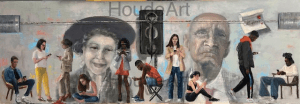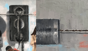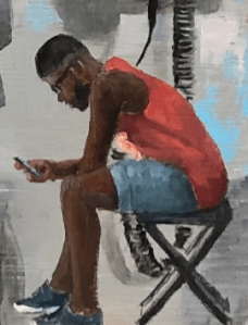 Cette toile est inspirée de mes déplacements dans le métro de Montréal où rares sont les voyageurs qui n’ont pas les yeux fixés sur leur cellulaire. Ils semblent dans une bulle, inconscients de ce qui se passe dans la réalité non virtuelle. Elle est aussi inspirée par la solitude de plusieurs personnes âgées qui n’ont pas accès à ces nouveaux moyens de communication.