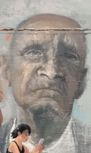 Le traitement au fusain des personnages en arrière-plan permet de les flouter et sert à souligner leur exclusion. Toutefois, leur expression montre qu’ils sont bien présents…un sourire bienveillant et compréhensif pour elle; une attitude fière et déterminée pour lui.